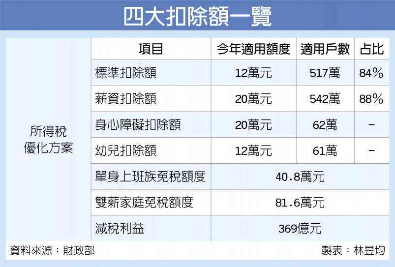財政部4月11日指出,2019年將提高標準扣除額、薪資所得、身心障礙及幼兒扣除額等4項扣除額,讓年薪40.8萬元以下、雙薪家庭年薪81.6萬元以下,或4口之家年薪123.2萬元以下的國人,均可不用繳所得稅,預估將有542萬戶受惠,減稅利益369億元。