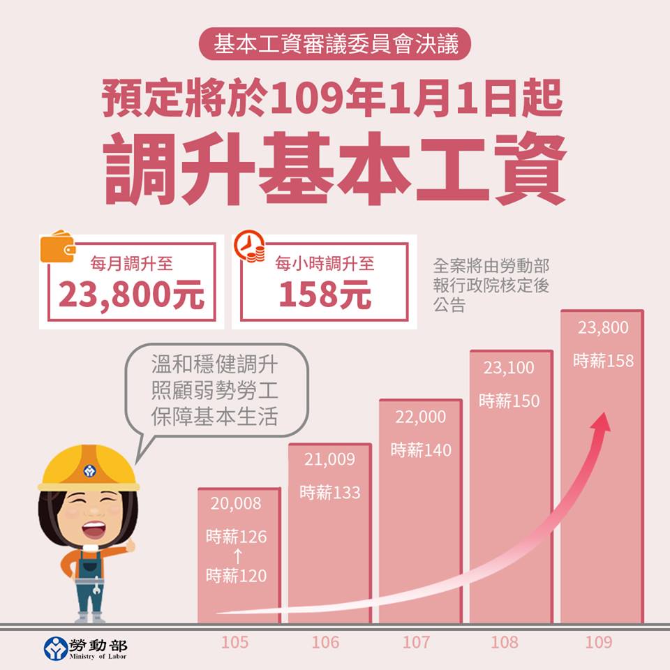 基本工資審議委員會於8月14日召開第34次會議,經勞、資、學、政各方委員討論,獲致結論:自109年1月1日起,每月基本工資由23,100元調整至23,800元,調升700元,調幅3.03%;每小時基本工資由150元調整為158元,調升8元,調幅5.33%。將由勞動部陳報行政院核定。