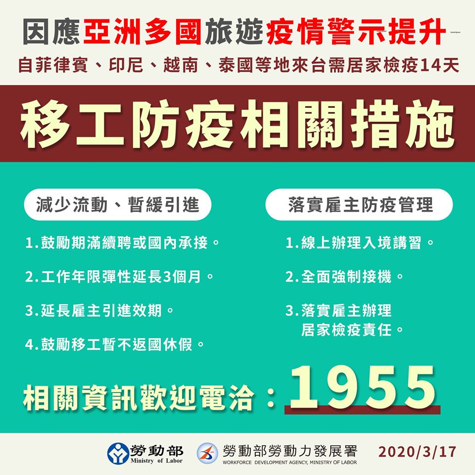 印尼、越南、菲律賓及泰國等移工來源國,將自3月19日起,嚴重特殊傳染性肺炎(COVID-19)疫情建議等級提升至第3級,但是自3月17日16時尚未登機入境者,依規定均須居家檢疫14天,不得外出工作。勞動部推出「鼓勵移工期滿續聘、國內承接、暫不返國」措施,並依據《嚴重特殊傳染性肺炎防治及紓困振興特別條例》第7條報請指揮官同意採取必要措施,及增定「入境移工居家檢疫計畫書」,呼籲雇主及仲介公司全力協助配合,以免移工入出境造成國內防疫破口。