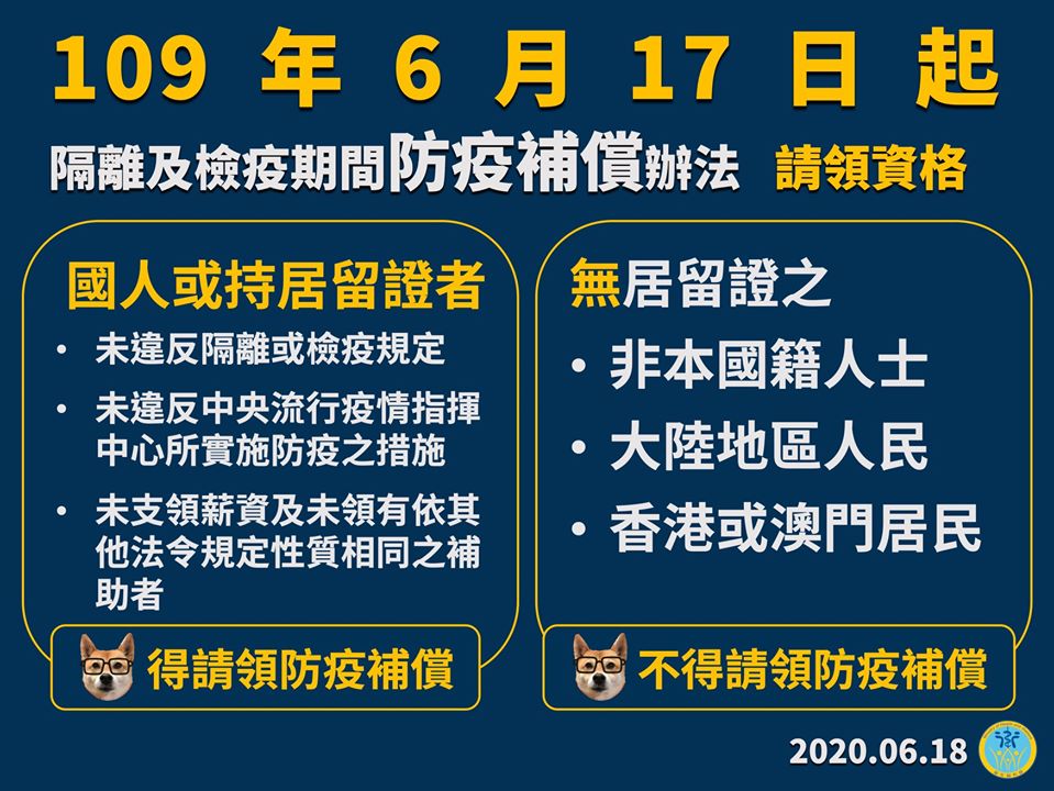 自109年6月17日起,「國人」或「持居留證者」始得請領防疫補償。「無居留證」之非本國籍人士、大陸地區人民、香港或澳門居民「不得」請領防疫補償。「國人」或「持居留證」之受隔離或檢疫者或照顧生活不能自理之受隔離或檢疫者,仍須遵守防疫規定,隔離或檢疫期間,均未違反隔離或檢疫相關規定、未違反中央流行疫情指揮中心所實施防疫之措施、未支領薪資及未領有依其他法令規定性質相同之補助者,才符合防疫補償請領資格。